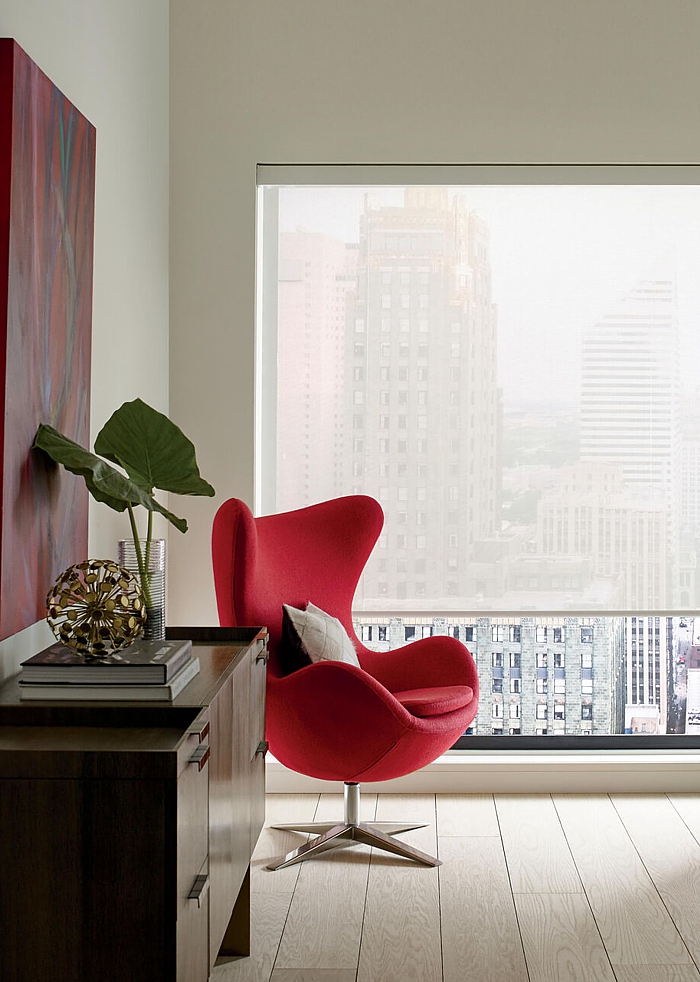 Because they are cordless, shutters are a great option for kids’ rooms, and they’re safe for pets too. Hunter Douglas Palm Beach Polysatin shutters, in particular, are durable enough to stand up to hours of play, and they’re easy to clean with a light vacuum or a damp cloth.